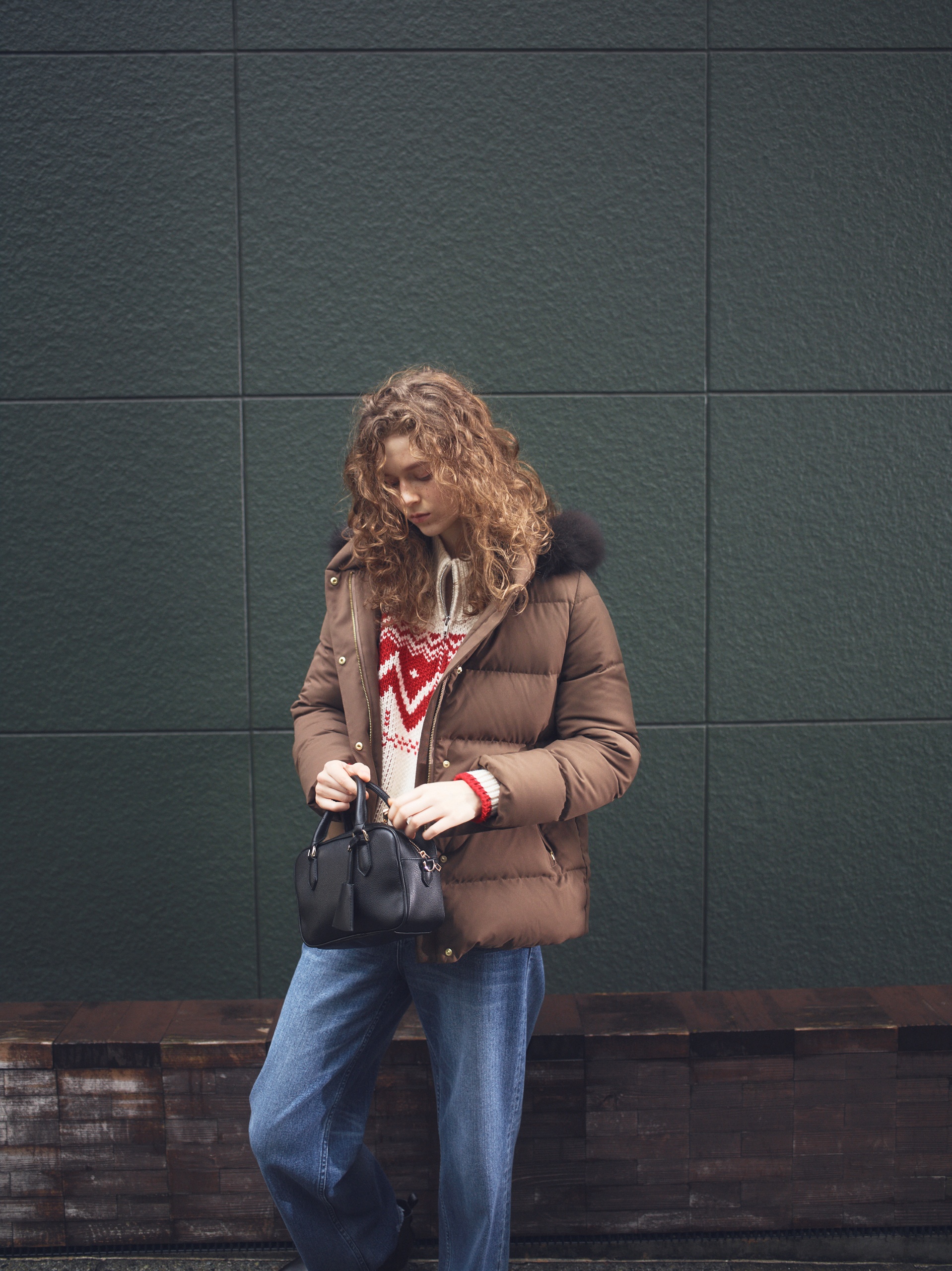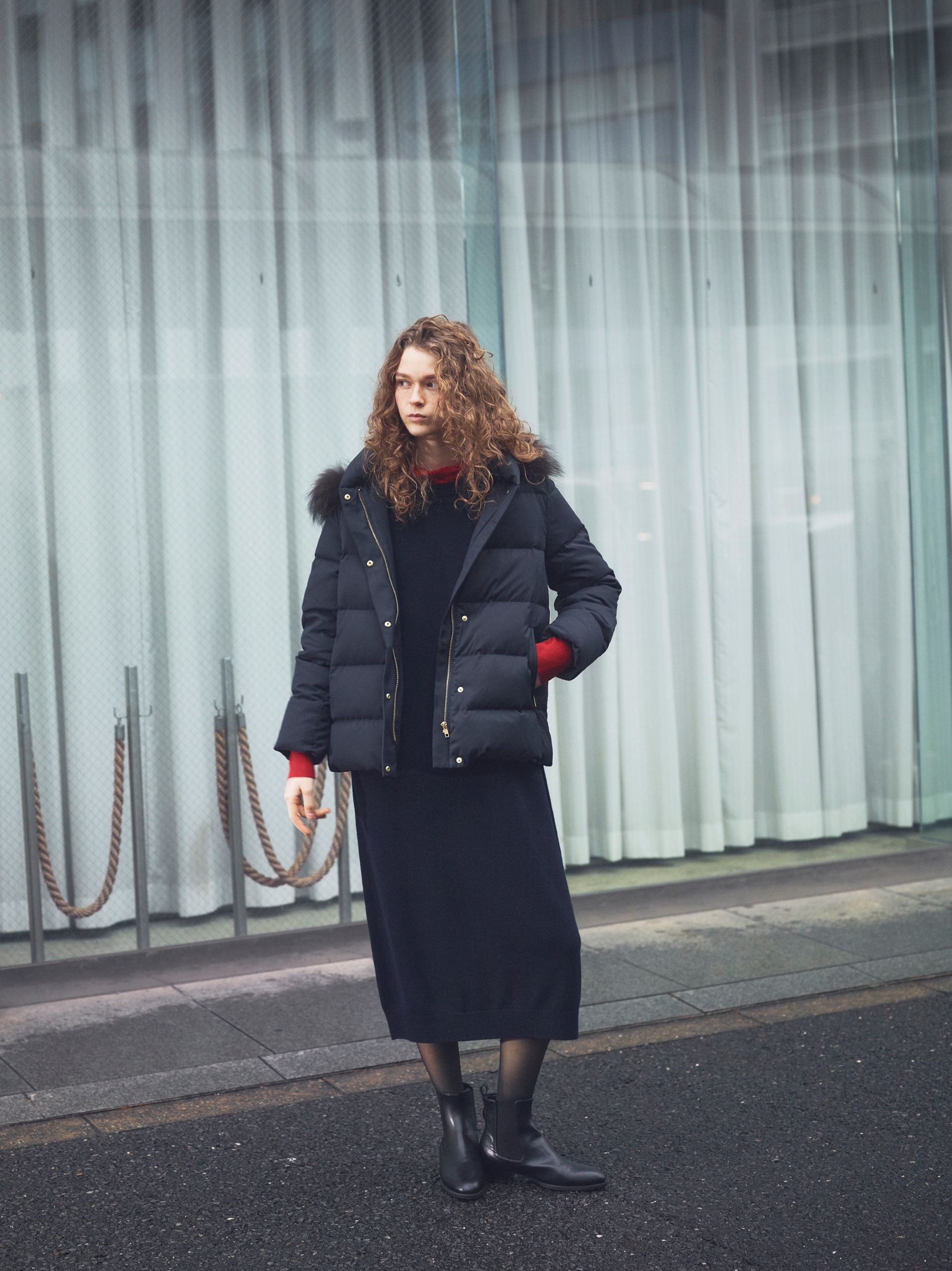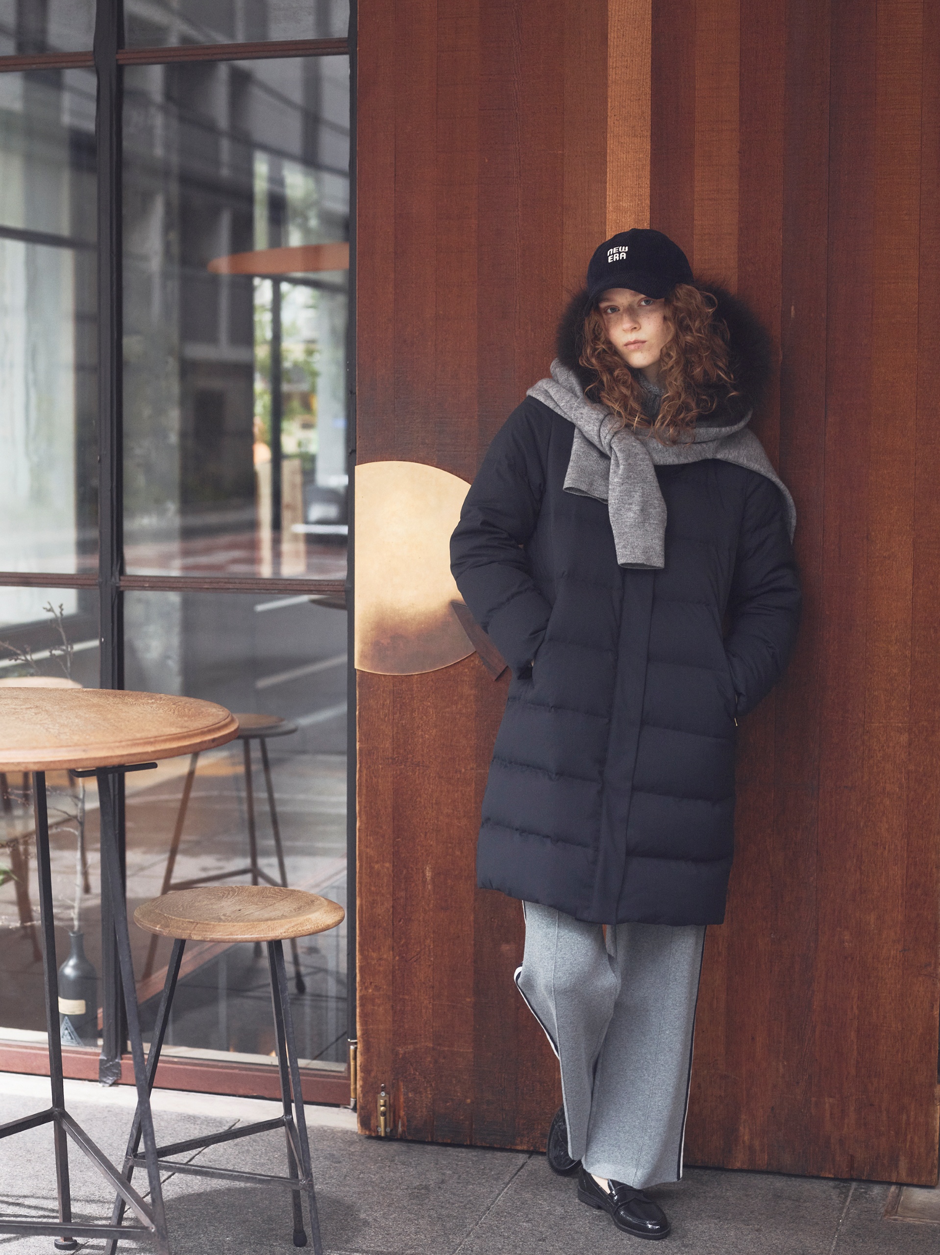 ダウンの硬派なデザインを逆手に取ってヴィンテージムードなコートをはさみ、遊び心の分かる女性をイメージ。顔まわりをふわっとおおうフードにあしらわれたブラウンファーがひかえめながらも華やぎをもたらす算段。