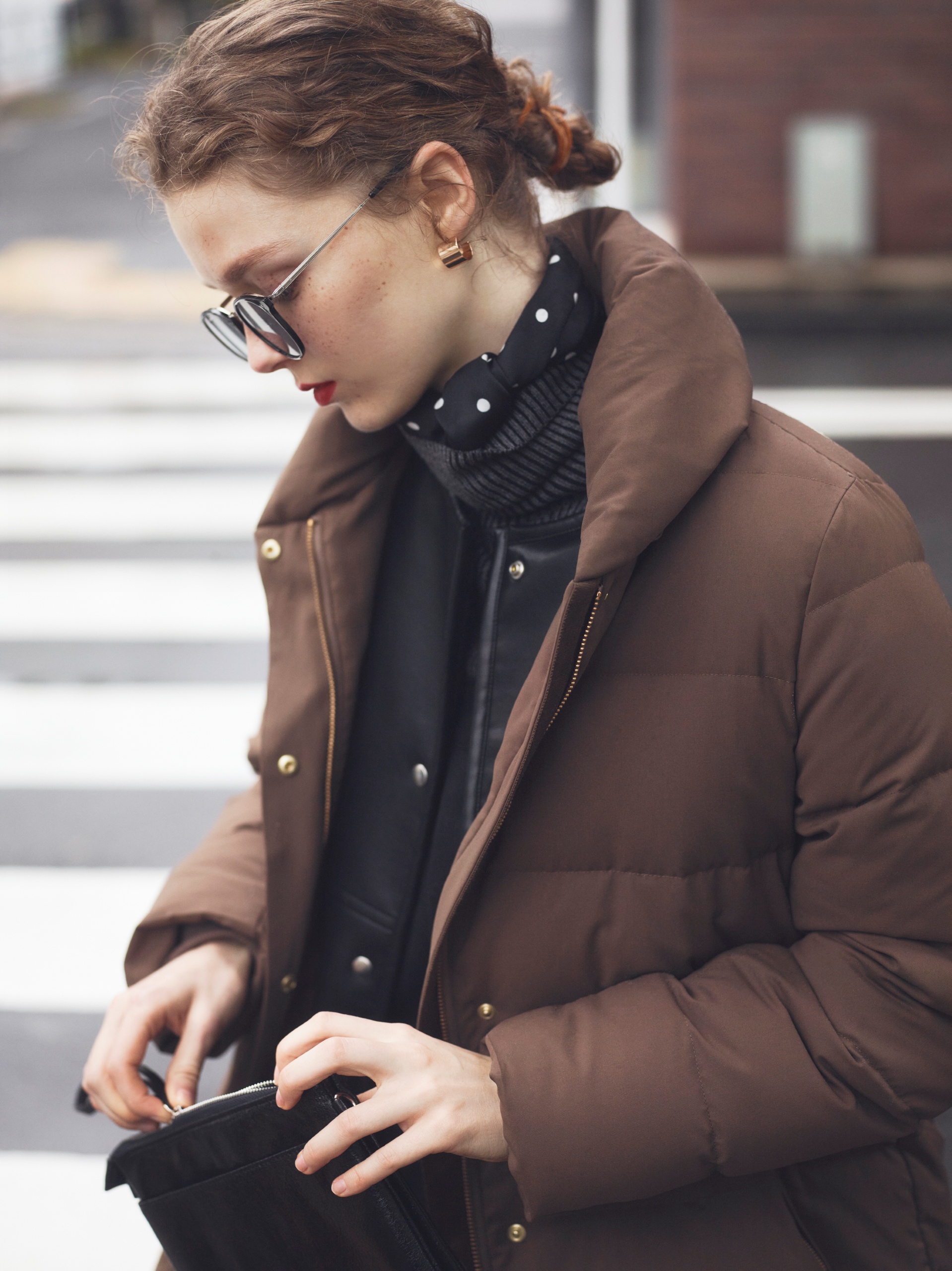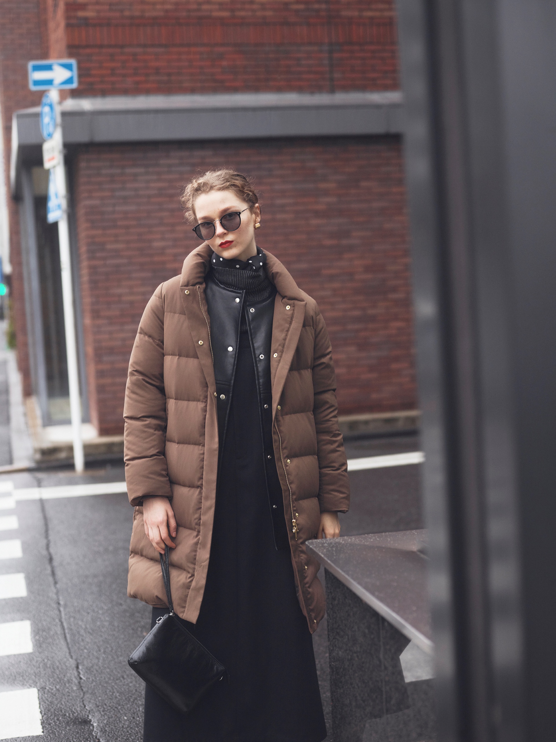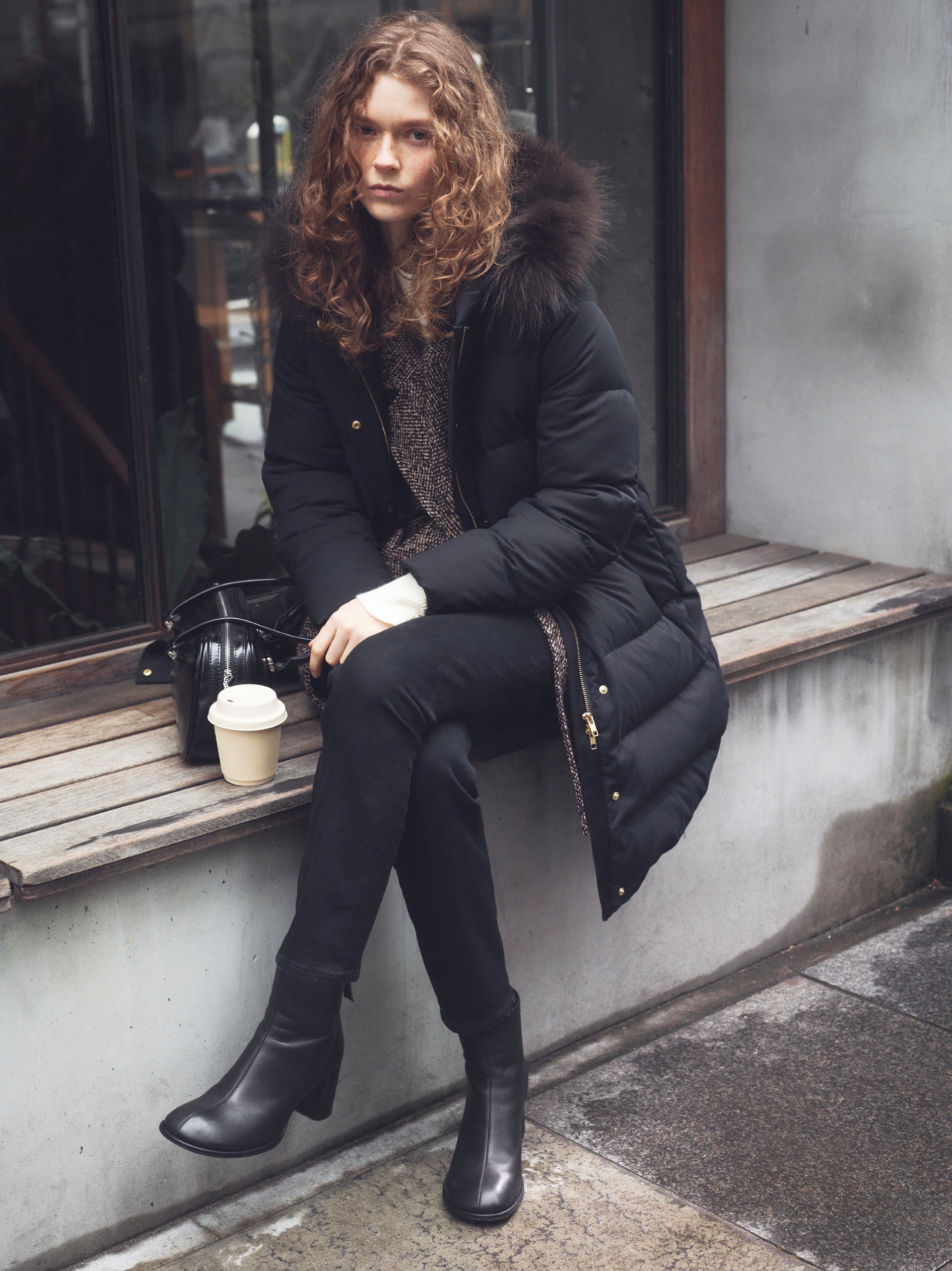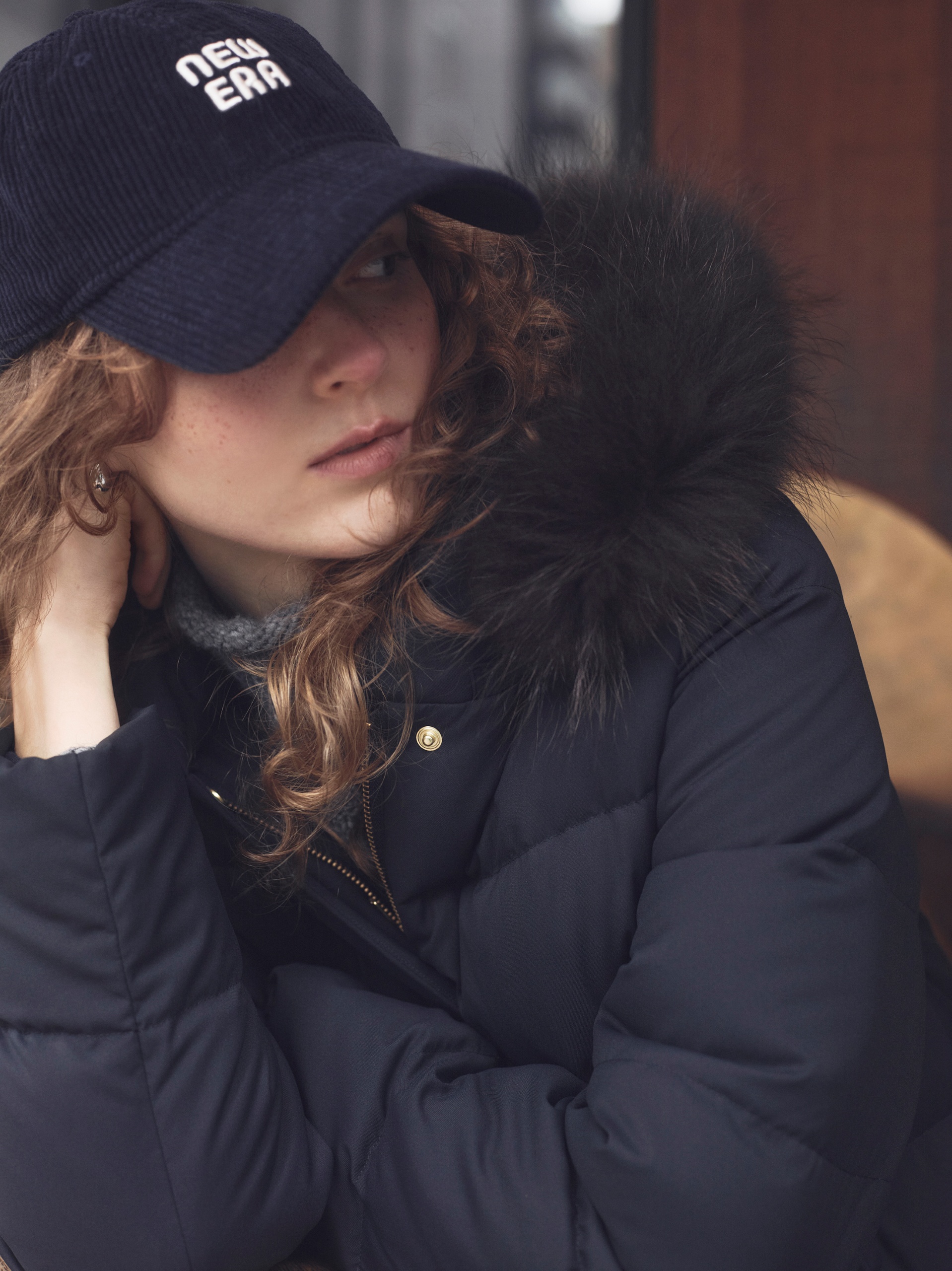 ダウンの硬派なデザインを逆手に取ってヴィンテージムードなコートをはさみ、遊び心の分かる女性をイメージ。顔まわりをふわっとおおうフードにあしらわれたブラウンファーがひかえめながらも華やぎをもたらす算段。