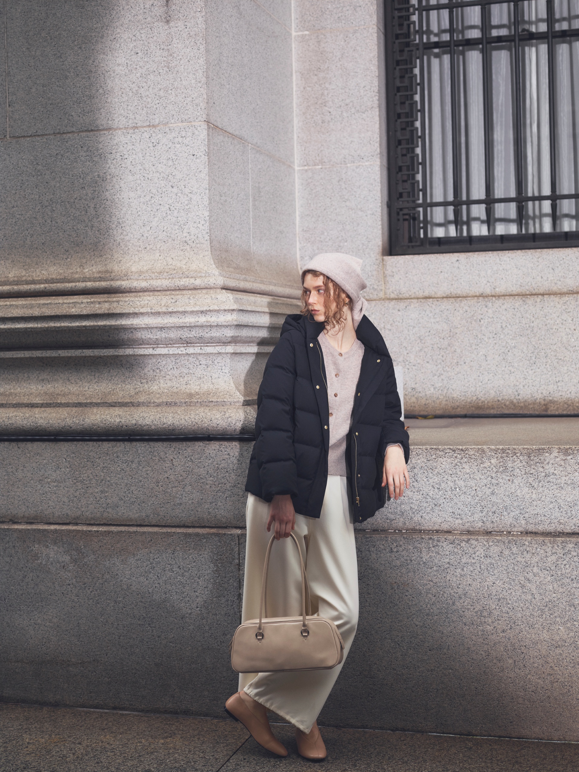 きちんと見えてどこか気楽という、服にも女性像にも求めたい理想のバランス。ベージュカーディガンと白パンツのともすればコンサバなセットも、ダウンありきで考えれば親近感をアピールできる。カーディガンとセットの頭に巻いたストールは、シーンによって肩にかけたりなどアレンジ自在。