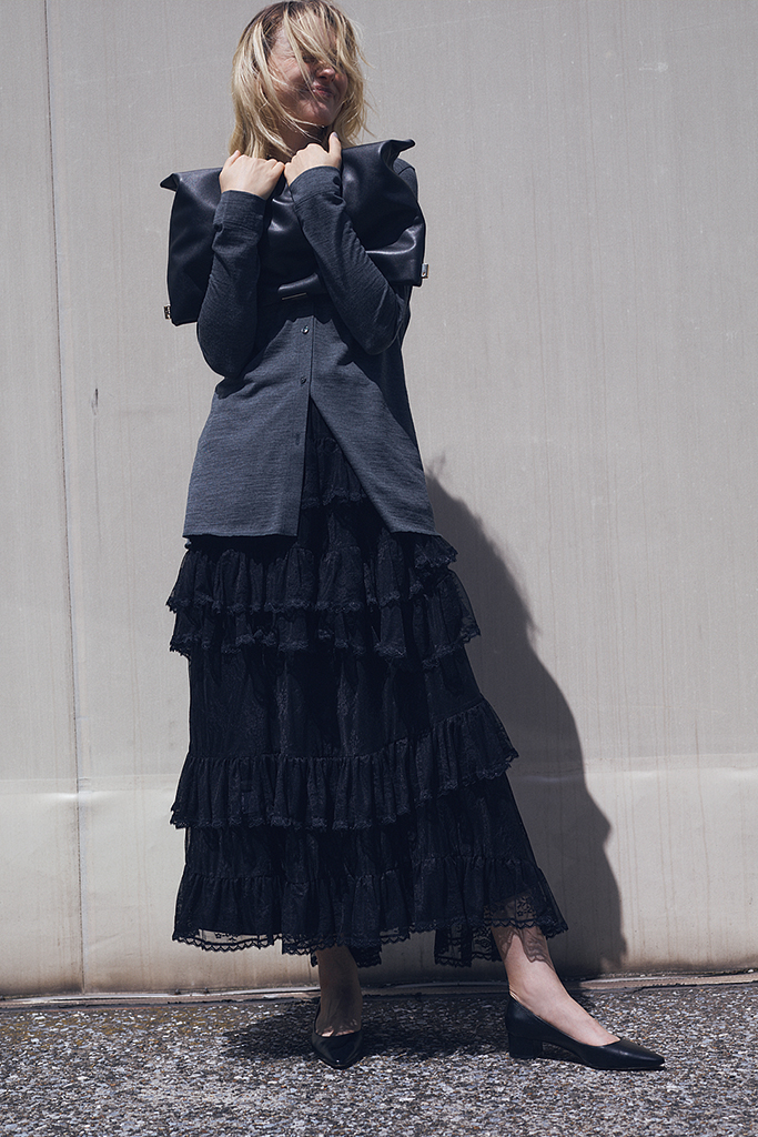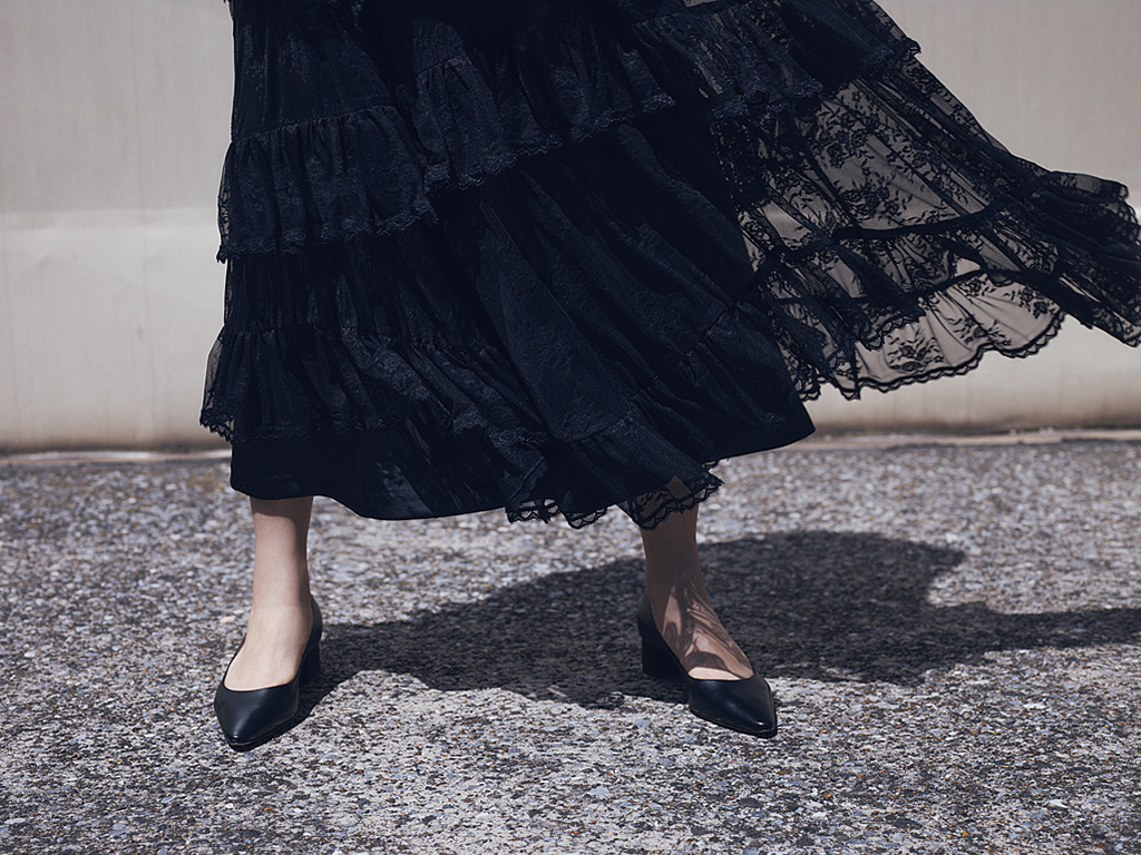 大胆なのに繊細さも感じられる総レースの透け感。こだわりが光るスカートが、黒を「なんとなく」では選ばない意思のある女性像を演出。