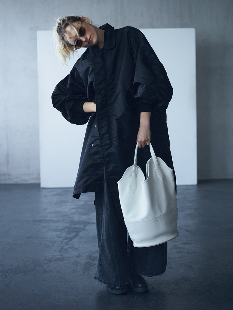 装飾も形によるメリハリもなくし、平坦にするほど引き立ってくるのが、黒という色が持つ本来の強さ。なにと組み合わせてもどんな着方をしても凜とした表情を保てる堂々たる佇まいは、ごくシンプルな装いにも自信を与えてくれる。