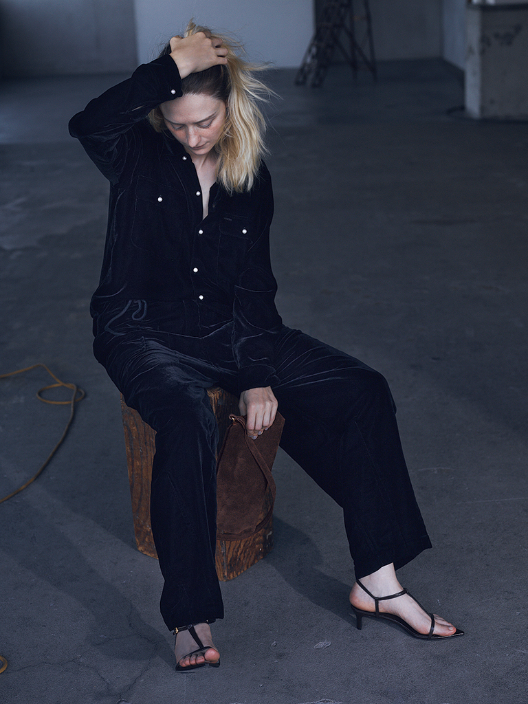重ね着してももたつかない絶妙な身ごろのカットソー。ひかえめなタートルは窮屈感なく、くしゅっとたるませても決まる。腰まわりはコンパクトながら脚線を拾わない絶妙なゆるさ黒デニムは、双子のセシリーとともにジュエリーブランドを立ち上げ、モデルとしても活躍するアマリーとアッパーハイツとのコラボアイテム。