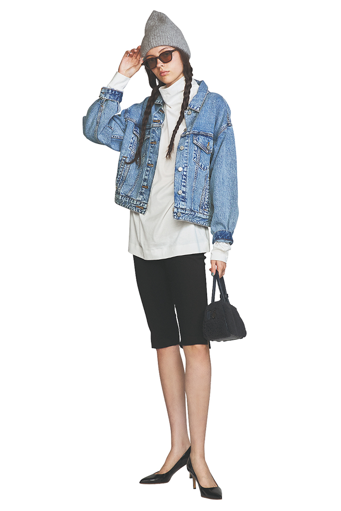 好感度高めの首元やえりを生かして、カジュアルなデニムアイテムに品格を付与。脱力感をとりのぞき、ワンランク上のスタイリングにアップデート。ルーズなジャケットが、中に着た細身シルエットを強調しいっそう華奢に。