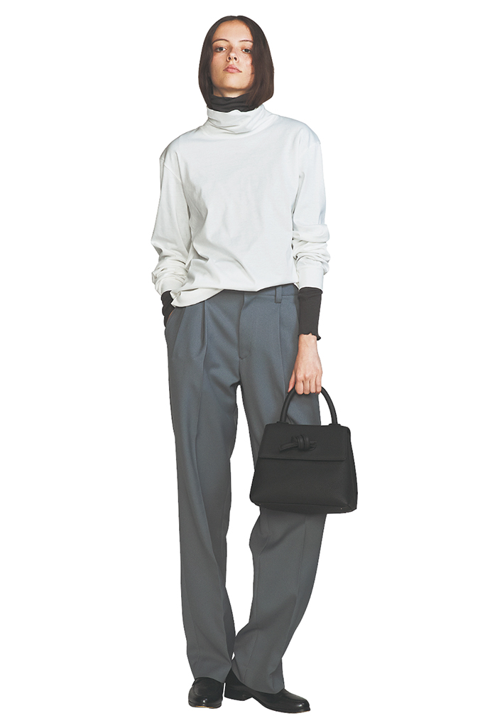 白タートルネックトップスは着まわし。中に着たグレーボトルネックプルオーバー 17,600円/TICCA グレーパンツ 26,180円/Oblada(シンチ) バッグ 56,100円/VASIC(ヴァジックジャパン) ローファー 16,390円/A de Vivre