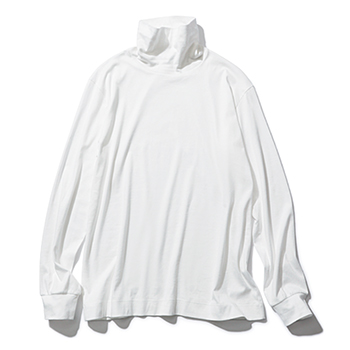 スーピマコットンを使用した、身ごろもそでも、首まわりにもゆとりを持たせたタートルネックのカットソー。ニットほどかっちり見えず、カジュアルな装いにもマッチ。カフス仕立てのそでで、まくったときもぴったりとまる。
