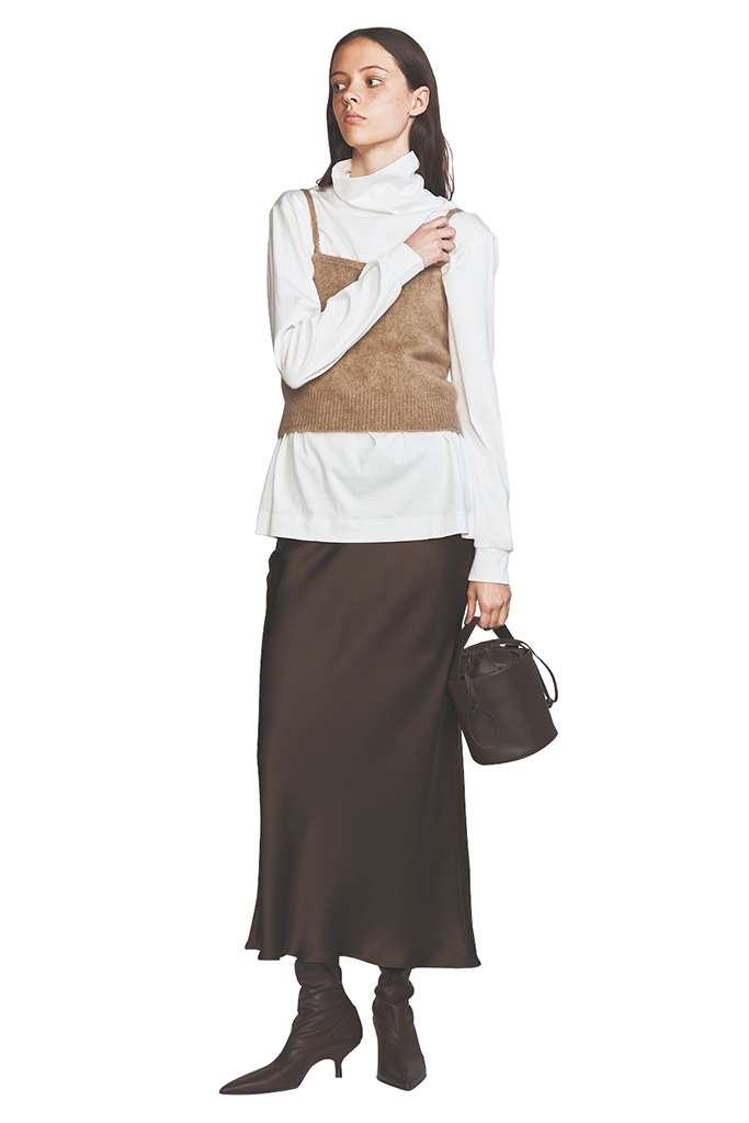 白タートルネックトップスは着まわし。ベージュファーニットキャミソール 58,300円/ebure(LITTLE LEAGUE INC.) 茶マキシスカート 38,500円/EDIT.FOR LULU(エディット フォー ルル) バッグ 66,000円/thehighlights ロングブーツ 126,500円/GIABORGHINI(ショールーム ロイト)