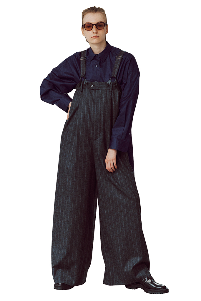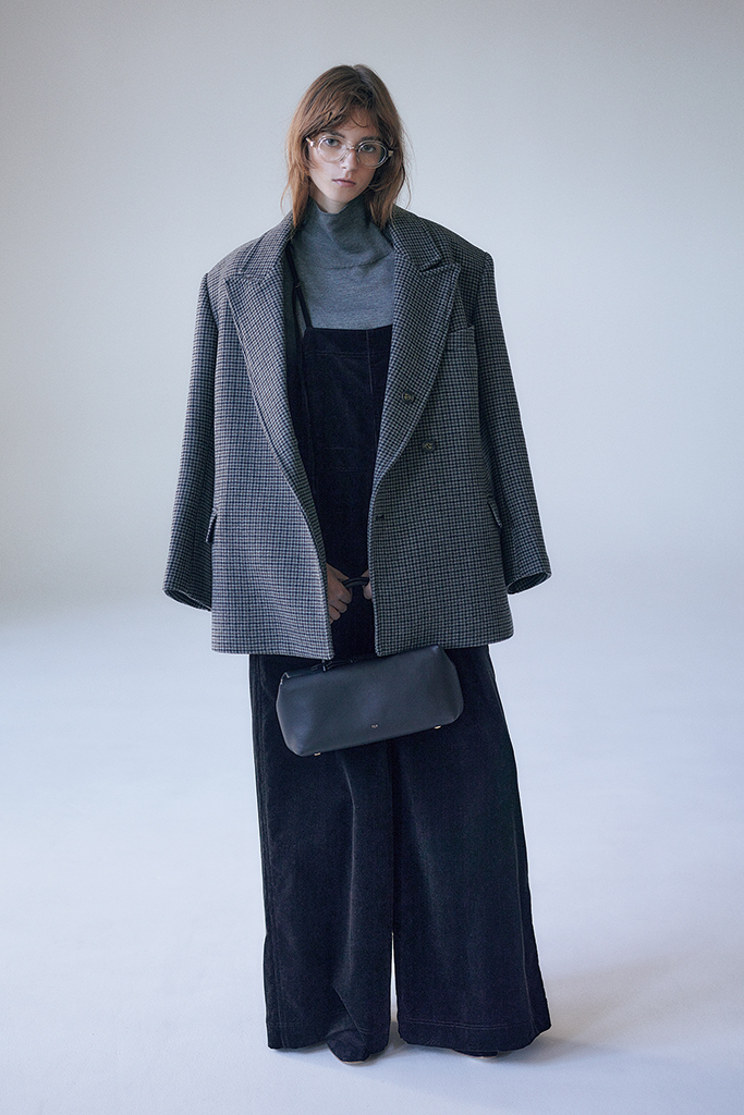 ほっこり見えやすいチェック柄が、冷静な色とジャケットの角ばった形のおかげでスマートに洗練される。美形なサロペットでなじみよく少しの親しみやすさも加味。