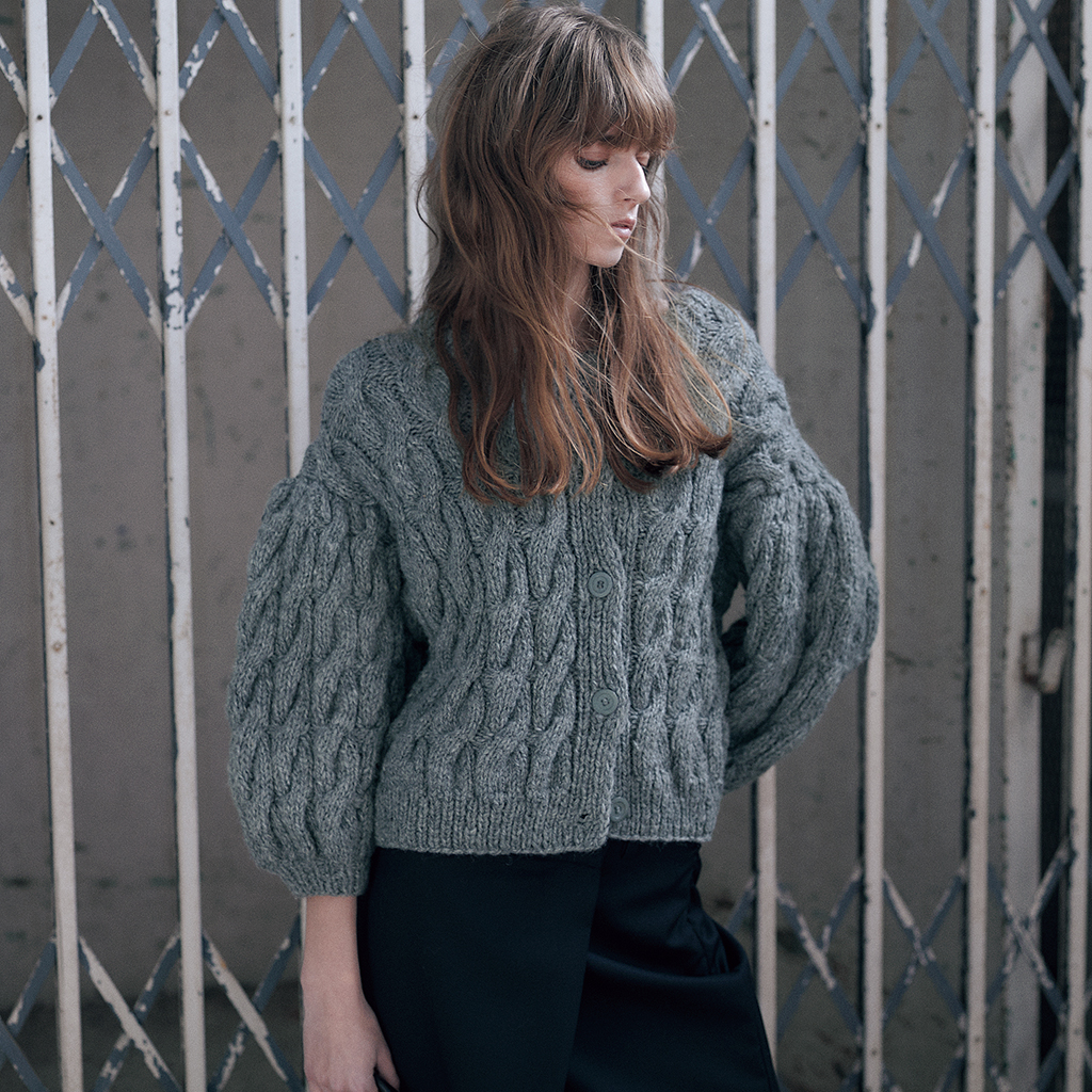 そでのふくらみに加えて、立体的な編み地も効いたガーリーな1枚。ほっこり見えないダークグレーに、ボトムもタイトな黒を選んで、ニットのデザイン以外はシャープを徹底。