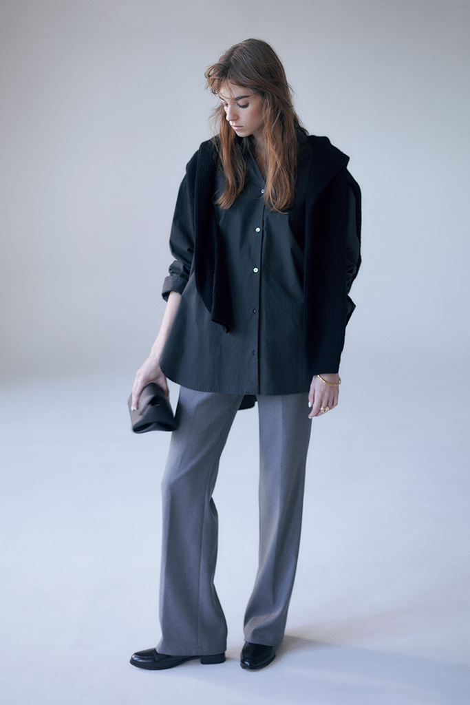 シャープな印象をそなえつつ、黒ほどエッジが効きすぎない。チャコールグレーの濃くもあいまいな色みは、いろんなテイストMIXをうまくなじませるのにうってつけ。