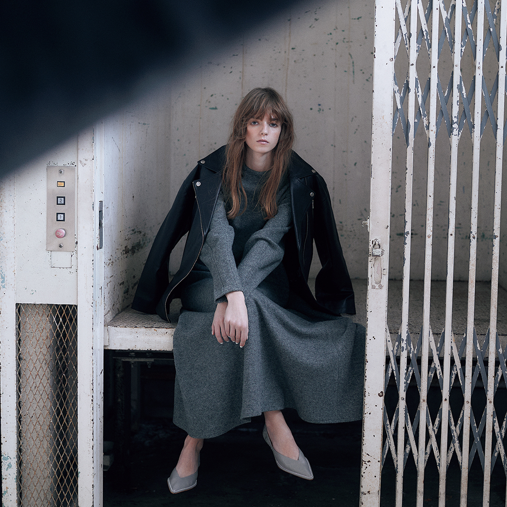 黒同様に使い勝手がよく、黒と合わせたときも緩急のつくグレーコート。迫力のあるレザーフレアスカートがマイルドに着地。デザインをそぎ落としたミニマルなルックスで、ぼやけがちなグレーでもシャープな印象。