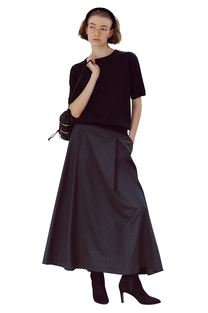 「ほぼ黒」の地味な色の差で、ダークトーンの間のびを回避。ダブルタックのスカートでさらにリズムづけ。