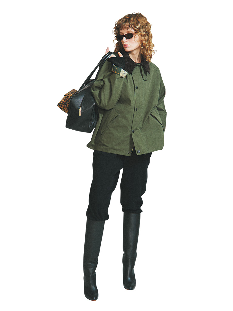 【POINT】レザーのロングブーツにパンツをINする、クラシカルな足元づくり。確固たる気品とスレンダーなシルエットにより、再燃中のミリタリージャケットを簡単に女性らしく落とし込める。