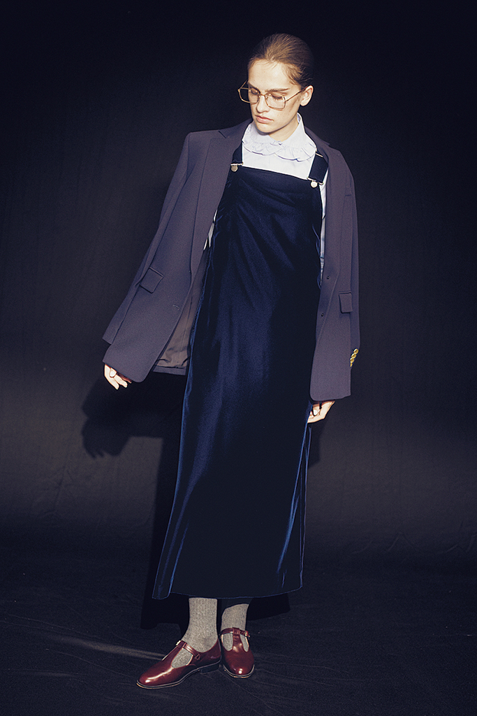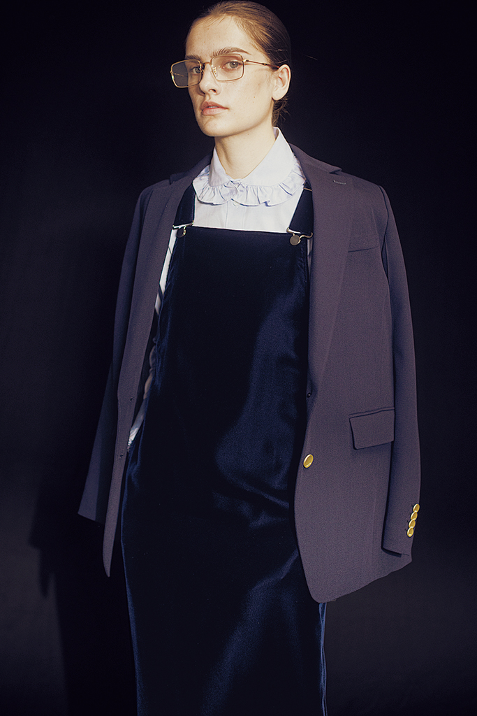ネイビージャンパースカート 35,970円/ユナイテッドアローズ(ユナイテッドアローズ 渋谷スクランブルスクエア店) ブルーフリルシャツ 40,700円/マディソンブルー ネイビージャケット 75,900円/ebure(LITTLE LEAGUE INC.) 眼鏡 25,740円/Ray-Ban(ルックスオティカジャパン カスタマーサービス) タイツ 6,050円/MES CHAUSSETTES(ジャック・オブ・オール・トレーズ プレスルーム) シューズ 18,920円/A de Vivre