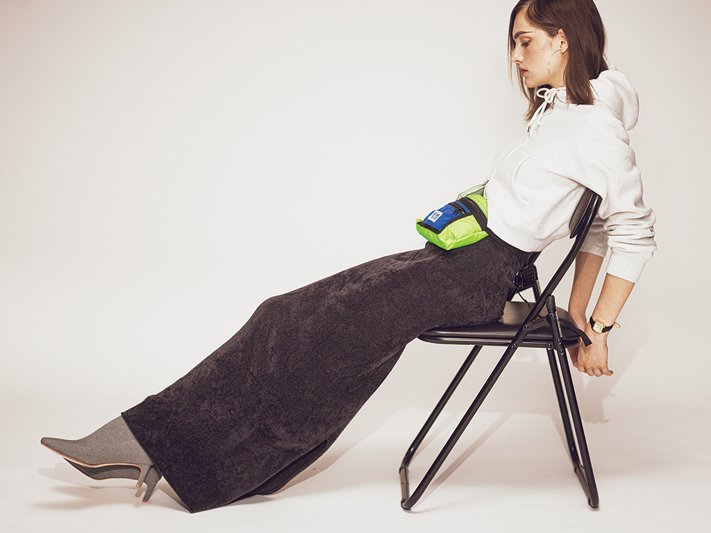 グレーニットロングスカート 34,100円、ライトグレーショート丈フーディ 34,100円/ともにPHEENY ピアス(片耳売り) 23,100円/e.m.(e.m. 青山店) 時計 17,600円/クルース ウエストポーチ 13,200円/BATTLELAKE OUTDOORS(メイデン・カンパニー) ショートブーツ 36,300円/TSURU By MARIKO OIKAWA