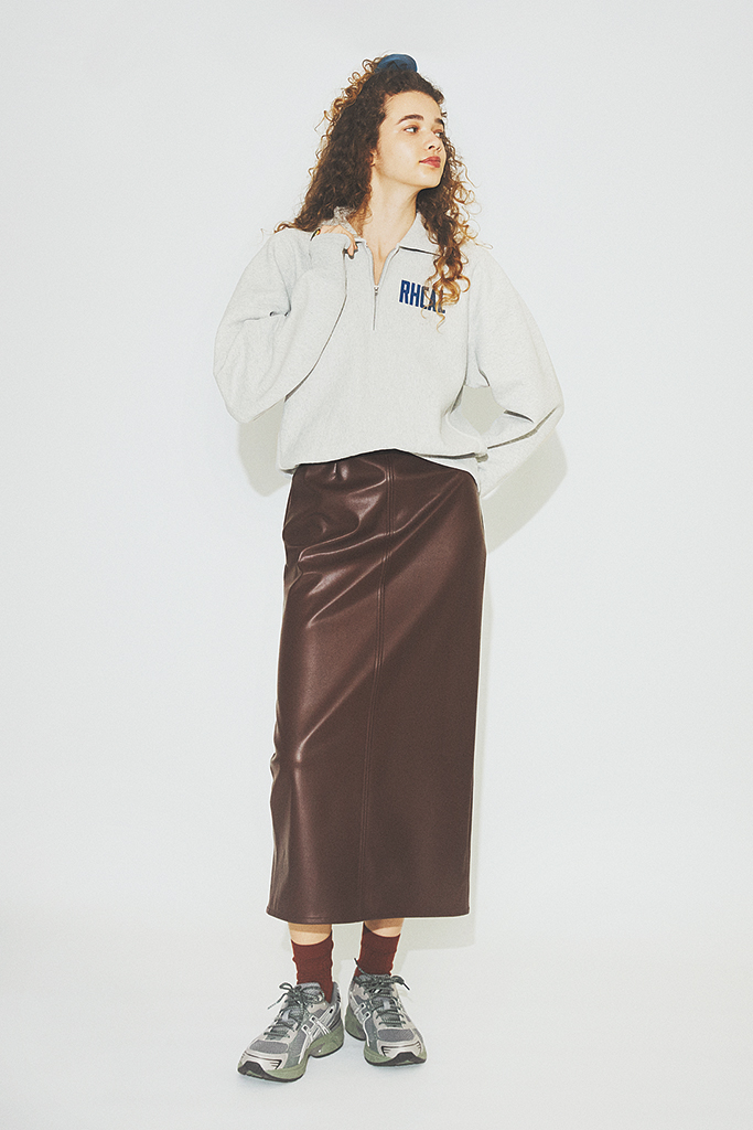 スカートが持つ直線的なシルエットと硬質な素材感で、部屋着感が出がちなスウェットを引き締め。スニーカーでハズすなら、ボトムとシューズをつなぐ同色のソックスでバランス良く。その緻密な計算も、カジュアルな装いを手抜きに見せないためのひと工夫。