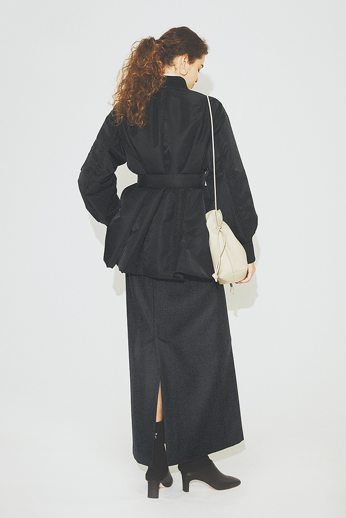 立体的なナイロンジャケットのボリューム感を、ストレートなIラインスカートがスマートに受け止める。重×長のバランスも、潔く入ったバックスリットが「抜け」として作用し、重厚感を回避。白のタートルとクリーンなバッグで光を差すことで、ALLブラックに近い配色にもリズムが生まれる。