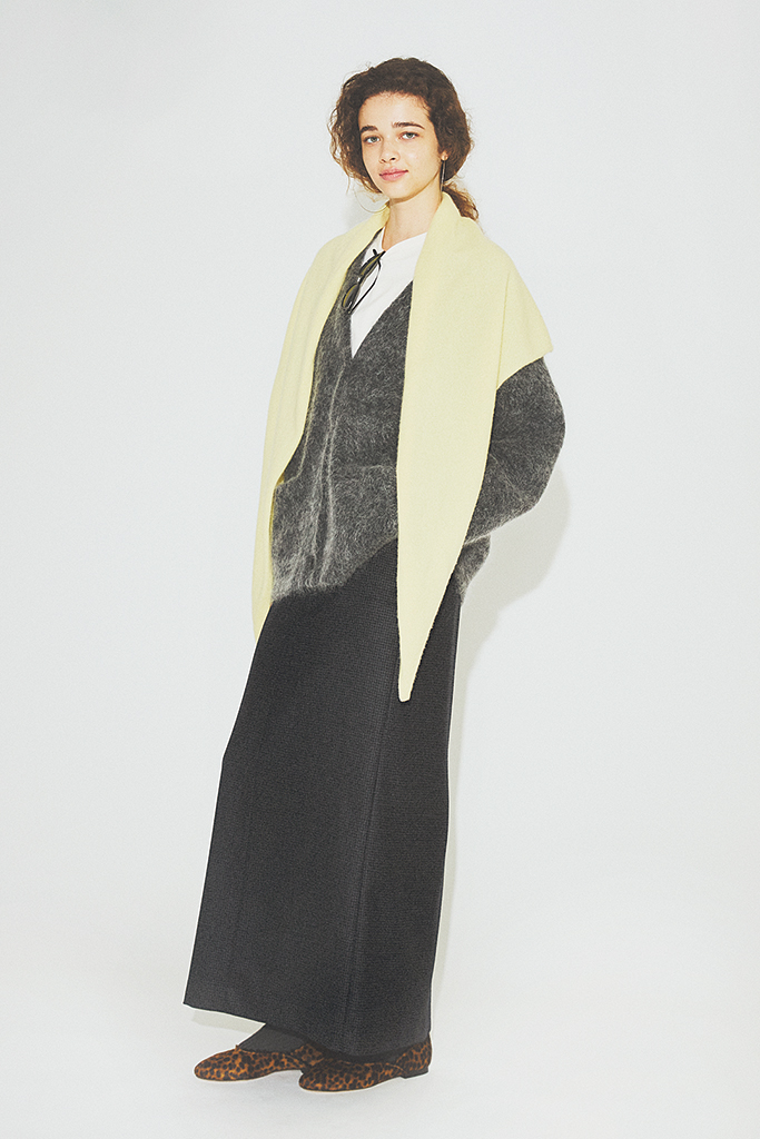 毛足の長いルーズなカーディガンで大胆に脱力してもラフに見えないのは、ボトムの持つ「紳士のような」たたずまいが功を奏すから。スカートの品格を信頼し、淡いイエローのストールやレオパード柄のシューズで遊び心を分散。ベーシックな着こなしでは終わらせない、計算ずくのアンバランスが手抜きに見えない秘訣。