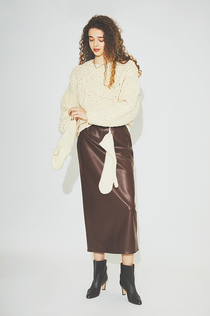 ニットの柔和なムードを、レザーのタフな質感が引き締める、異素材MIXの好例。ニットが持つ特有の膨張感も、レザーのシャープな光沢が視覚的にカット。スカートのIラインをじゃましない、クリーンな黒のヒールブーツでつなげば、都会的なムードがさらに加速する。