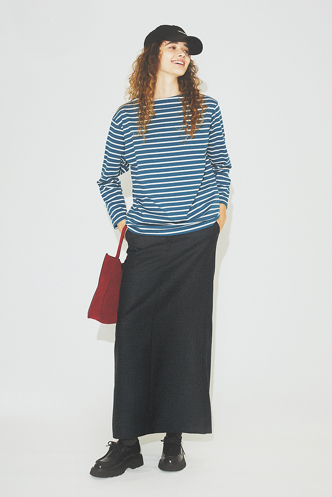 クラシカルなムードを秘めたチェック柄が、ボーダーのラフさを知的な方向へと導く。悪目立ちしないトラッドな微差のチェックだからこそ、柄どうしをぶつけてもトゥーマッチにならず、むしろ奥行きが生まれる。キャップや厚底シューズでカジュアルに振り切っても、スカートのIラインが大人としての冷静さを保つファクターに。
