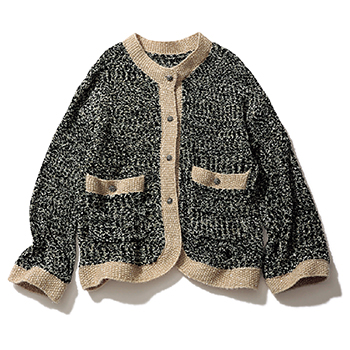 ツイードニットジャケット 26,400円/Jilky ベージュの縁取りがクラシックな表情を加速。繊細なラメを織りまぜたため、ニット特有の重厚感をのがせる。ラウンドの効いたえりやすそで、きちんとしたカーディガン感覚で重宝できる。