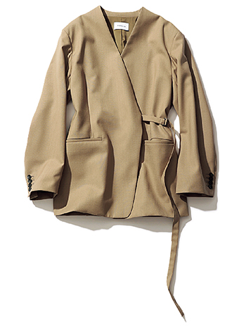 ベージュ共布ベルトつきノーカラージャケット 38,500円/スタニングルアー(スタニングルアー 青山店) くびれ部分をマークして、腰位置の高さをアピール。閉じて着ると生まれるVネックが、キレのいいトップス的な役割に。落ち感のあるベージュは、どう着ても女っぽさを残せる。
