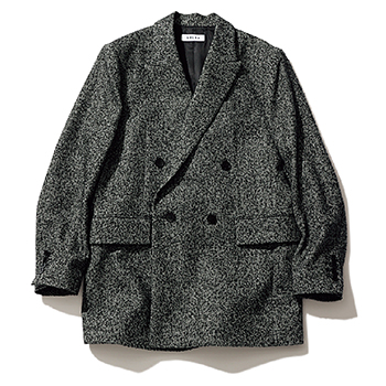 グレージャケット 35,200円/TODAYFUL(Life’s 代官山店) そでやすそからカットオフ仕様の裏地がちらりとのぞく、レイヤード風の異素材MIX。厚みのある肩パッドで、凝ったディティールながらマニッシュな見た目に落ち着く。