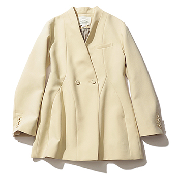 アイボリーノーカラージャケット 29,700円/Ameri キレイをあと押しする、なだらかに広がるAライン。ボタン位置を高めに設定することで、腰の位置も高く見えるうれしい視覚効果を発揮。肩口からすそに伸びるしなやかなラインが、膨張色をほどよく引き締める。