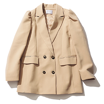 ベージュギャザーショルダージャケット 9,900円/LiLiRena ギャザーをほどこした小ぶりなボリュームスリーブで、ジャケット=マニッシュなイメージから脱却。立体的なえりが小顔効果を発揮。ヒップが隠れる丈感でスタイルカバーにも貢献。