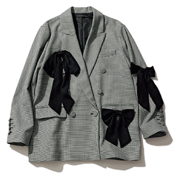 グレンチェックリボンつきジャケット 46,200円/TSURU By MARIKO OIKAWA インパクトのあるビッグリボンは取りはずし可能。白黒の千鳥格子をプリントしているため、ガーリーに転びすぎない。