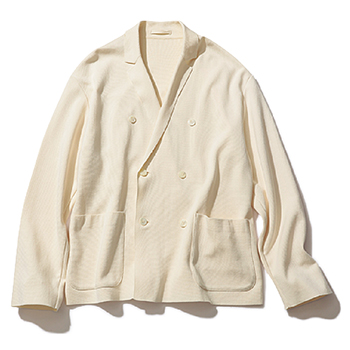 アイボリーニットジャケット 55,000円/HELLY HANSEN(ヘリーハンセン 原宿店) 男女兼用で着られるオーバーシルエット。さらりとしたテクスチャーだから、カーディガンのように手軽に羽織れる。細めのラペルがやわらかな素材と相まってかっちりしすぎず使いやすい。