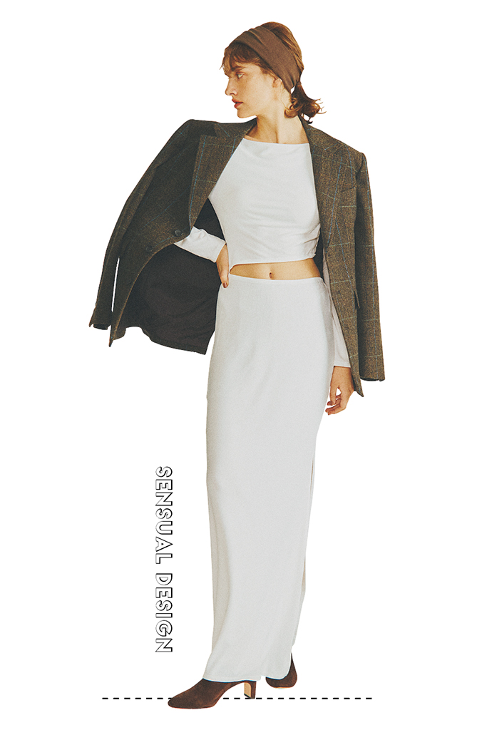 端正なジャケットでおおえるのをいいことに、まずはワンピで変化球。たとえばセットで着るだからハードルが下がる、センシュアルなデザインを。コラーゲンを含んだ、しなやかで肌あたりのいい素材に、おなかの大胆な開き。趣のあるチェックジャケットをレディに昇華。