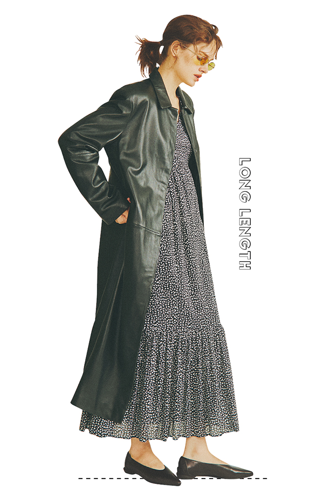 ワンピとの丈バランスを気にしなくていい、足首近くまであるコートのようなロング丈のジャケットを重ねて。ジャケットのハンサムな表情に箔がつき、マニッシュというよりモードな雰囲気。一見フェミニンな花柄のワンピも、ロングレザーとなら辛口。すその迫力が増し、たった2着でも十分な存在感。