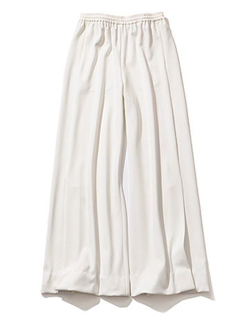 肌をすべるような、つるんとしたテクスチャーのワイドパンツ。やわらかなフレアスカートのようにニュアンスがつくシルエットで、クリーンな白パンツを身近な存在に。脚線が隠れることで、気になる部分が気にならないスタイルカバーにも貢献。