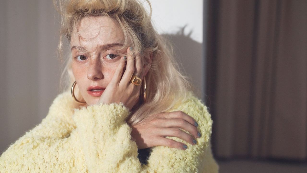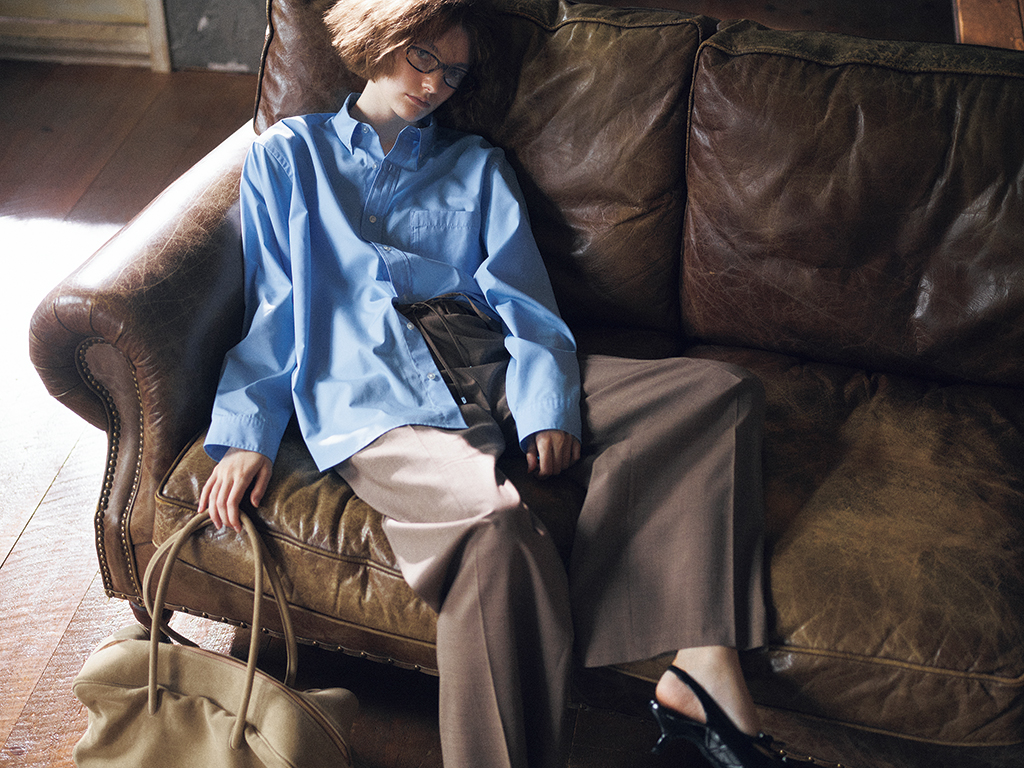 ヒップラインは拾わず位置を高く、脚をすっと流して縦長に見せる股上深めのストレートデニム。履き込んだような色あせた質感でもどこか品よく見えるのは白みがかったアイスブルーのおかげ。すっきりと履ける腰まわりのサイジングやセンタープレスがキレイを後押し。
