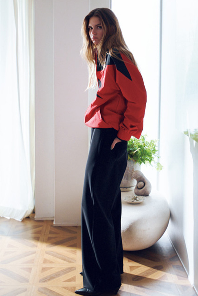 グレーのスウェットながら美形なストレートで、大人のリラックス感に。股上の深いハイウエストデザインで、ラクをしながら脚長に。シャツのすそからボタンを開けた逆Vのシルエットが、ワイドスウェットでもすっきり見える秘訣。
