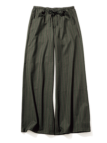 座りジワができにくい薄くてなめらかなウール素材。ウエストのひもが見えてもラフに転ばないのは、センタープレスをほどこしているおかげ。