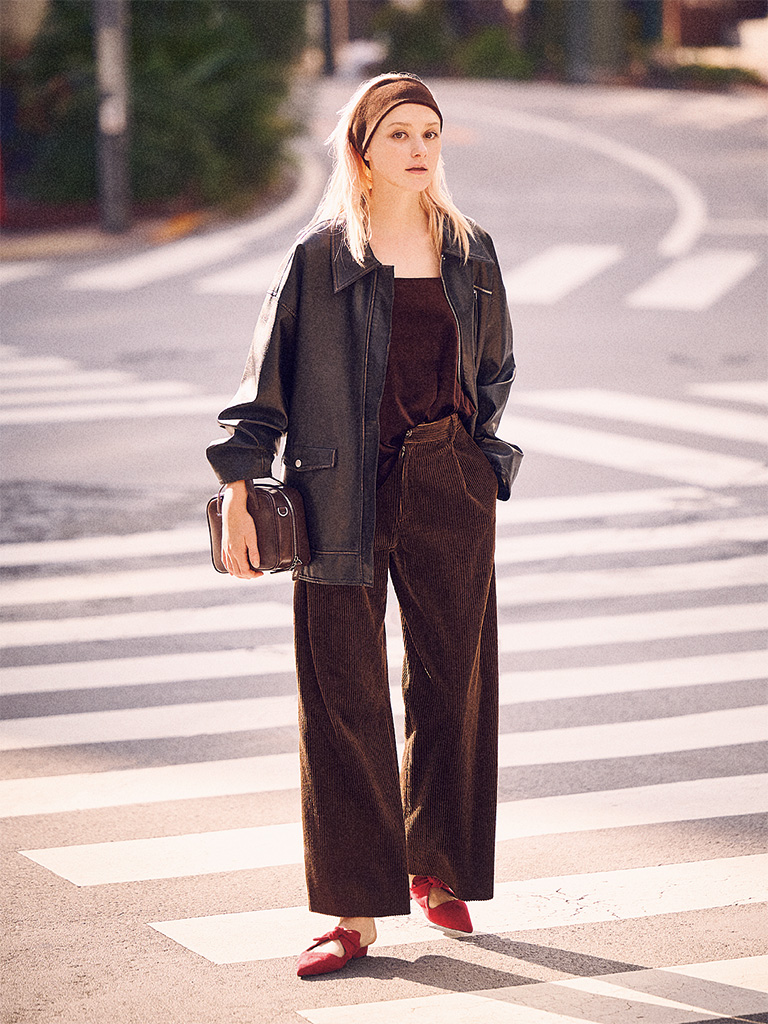 【POINT】ワントーンにメリハリをつけるジャケットとパンツの質感差。色あせた渋いレザーのブラウンとツヤ感のあるコーデュロイのブラウンとで、暗い配色のスタイリングに奥行きをプラス。