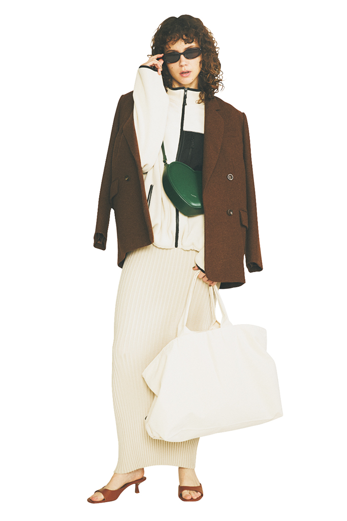 ボーイッシュなジップアウターも色は白、そして思わずふれたくなる、ふかふかの質感で甘さをプラス。カーディガンのような羽織りとして、1枚でフロントを締めてトップス風に、寒さが深まる少し先はアウターの下に着たりと長い期間楽しめる。