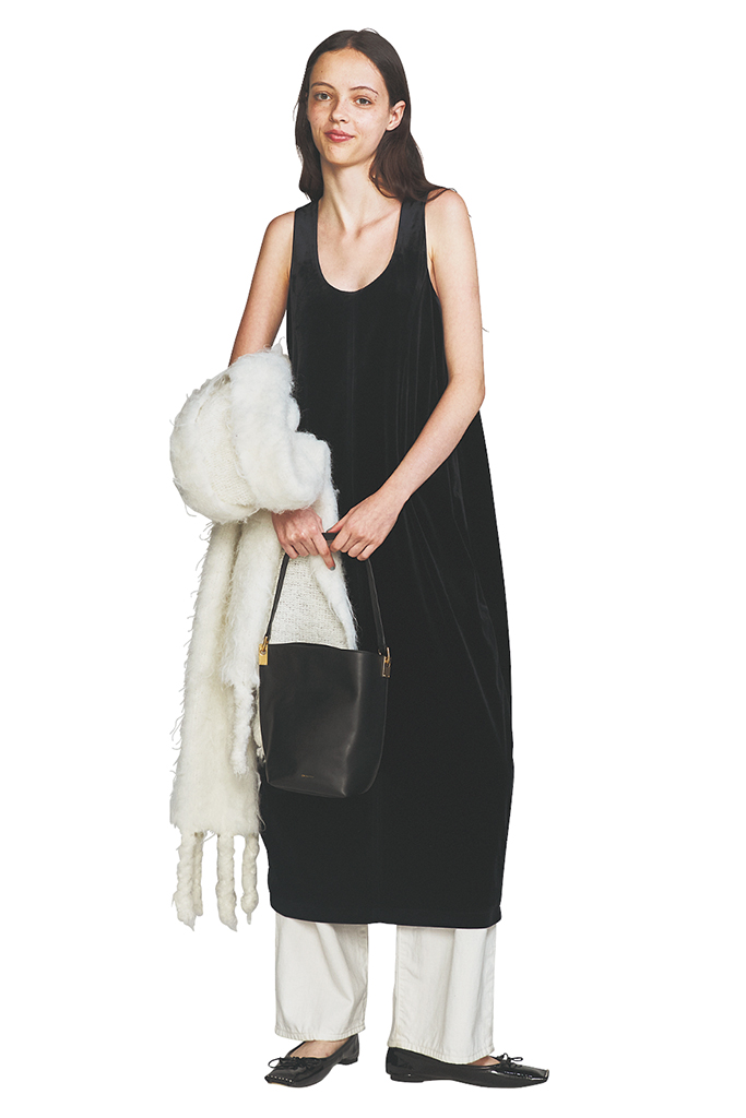 しっとりとしたツヤを放つベロアに、ドライなデニム。質感にも変化をつけたことで、シンプルなモノトーン配色を単調に見せない奥行きも獲得。