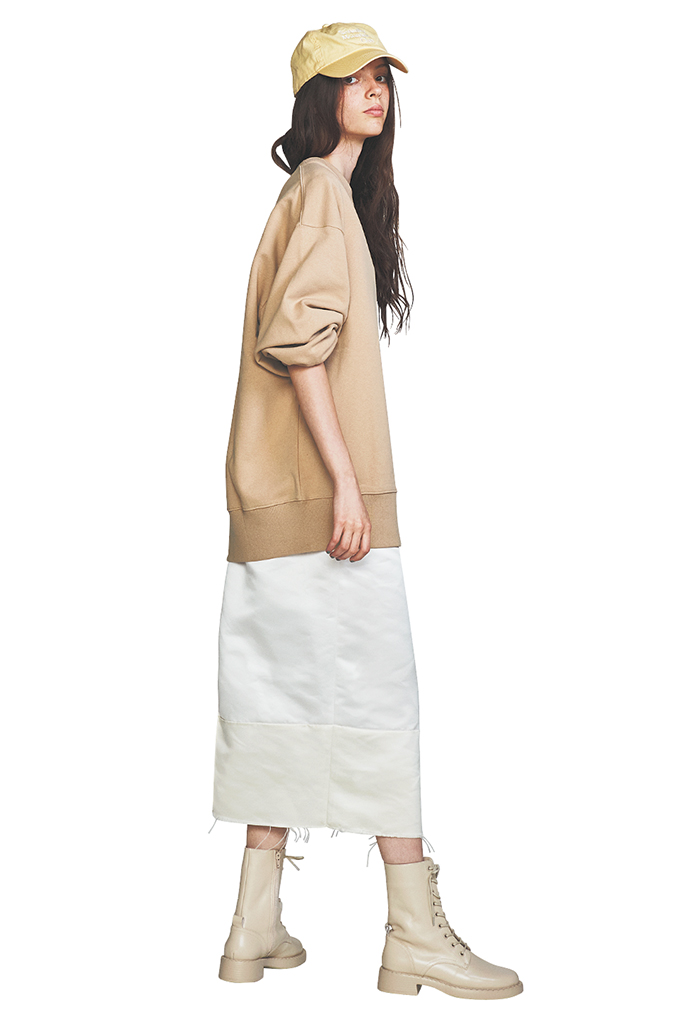 浮かれたトップスがクリーンに変わる上品なフレア。まっ白の明るさが清潔感を引き寄せつつ、派手なスウェットにも負けない存在感でバランスのいい見た目に。
