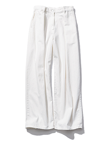 フランクなデニムを洗練させる混じりけのない白。トップスをINしたときにさまになるタックディテールでのっぺり見えも防ぐ。脚長効果を見込める深い股上。綿100%ながらやわらかく、ストレスフリーなはき心地。