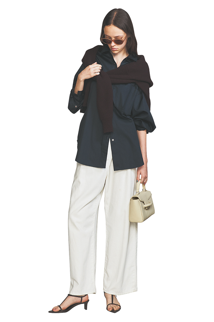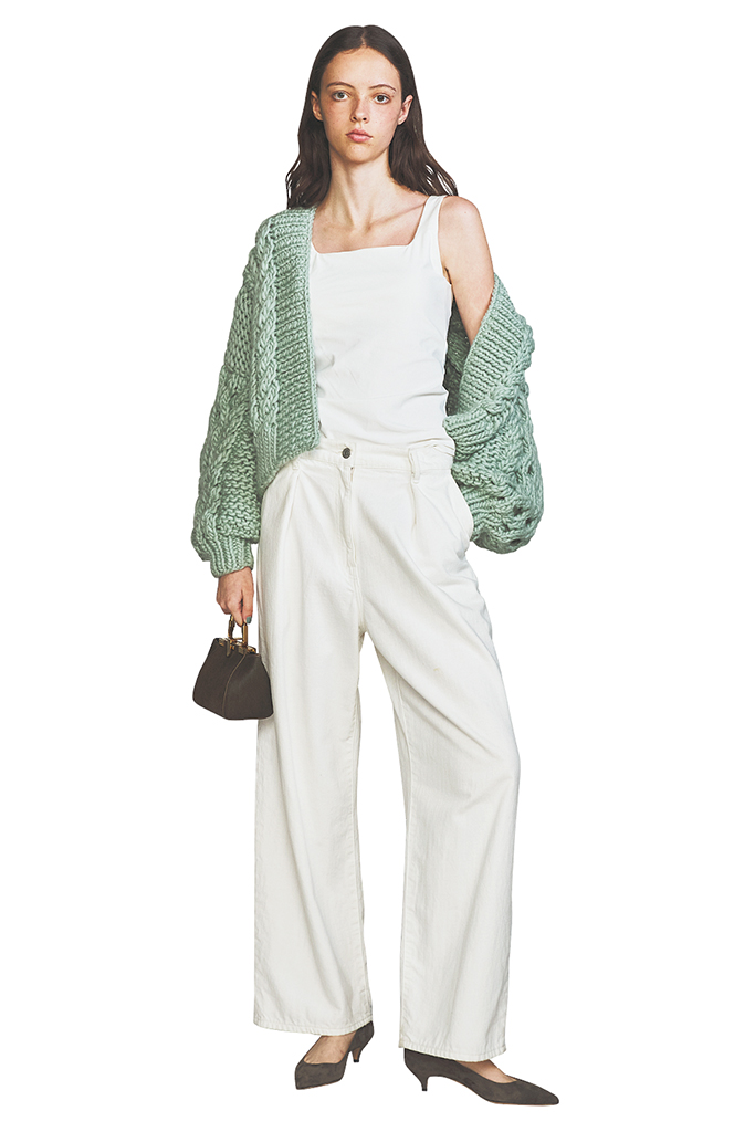 やや勇気を伴う一方で、装いに軽さをもたらしたり、クリーンな見た目に導いたりと利点も多い白ボトム。これからのトップスの厚みを軽量化してくれるから、これまで以上に活躍の幅が拡大。膨張して見せない抜けづくりのテクニックとともに、白ボトムだからかなう着回しバリエーションを模索。