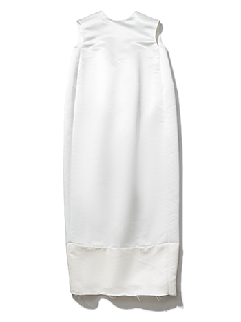フレアほどガーリーに傾かない白のIライン。ハリと厚みがあると、あたりが出にくくレイヤードしても美フォルムをキープできる。ボンディング風の厚手生地。白の無地なのに趣を感じる、パールさながらのリュクスな微光沢。