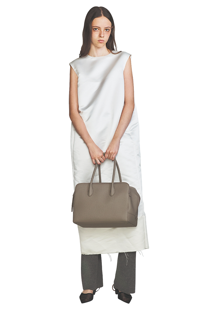 素材感と相まって、少しフォーマルな印象が強い白ワンピース。平日にも向く冷静なグレーの細身パンツを合わせてドレスダウン。すらりと伸びる縦のラインも強調されるため、そのまま1枚で着るより見た目もスマートに変われる。
