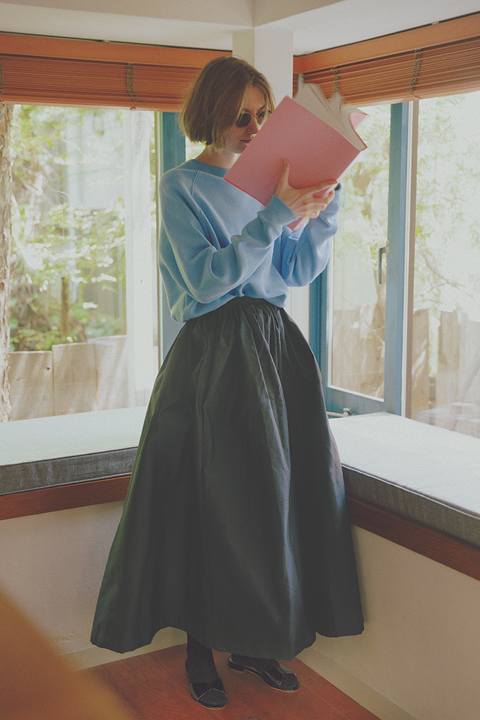 ハリのあるフレアスカートをつなげて、ヴィンテージライクなスウェットのイメージを刷新。くたっとしたゆとりあるシルエットのグレーが抜けとして作用し、ソックス&パンプスで足元まで女っぽくても「甘すぎ」には見えない。