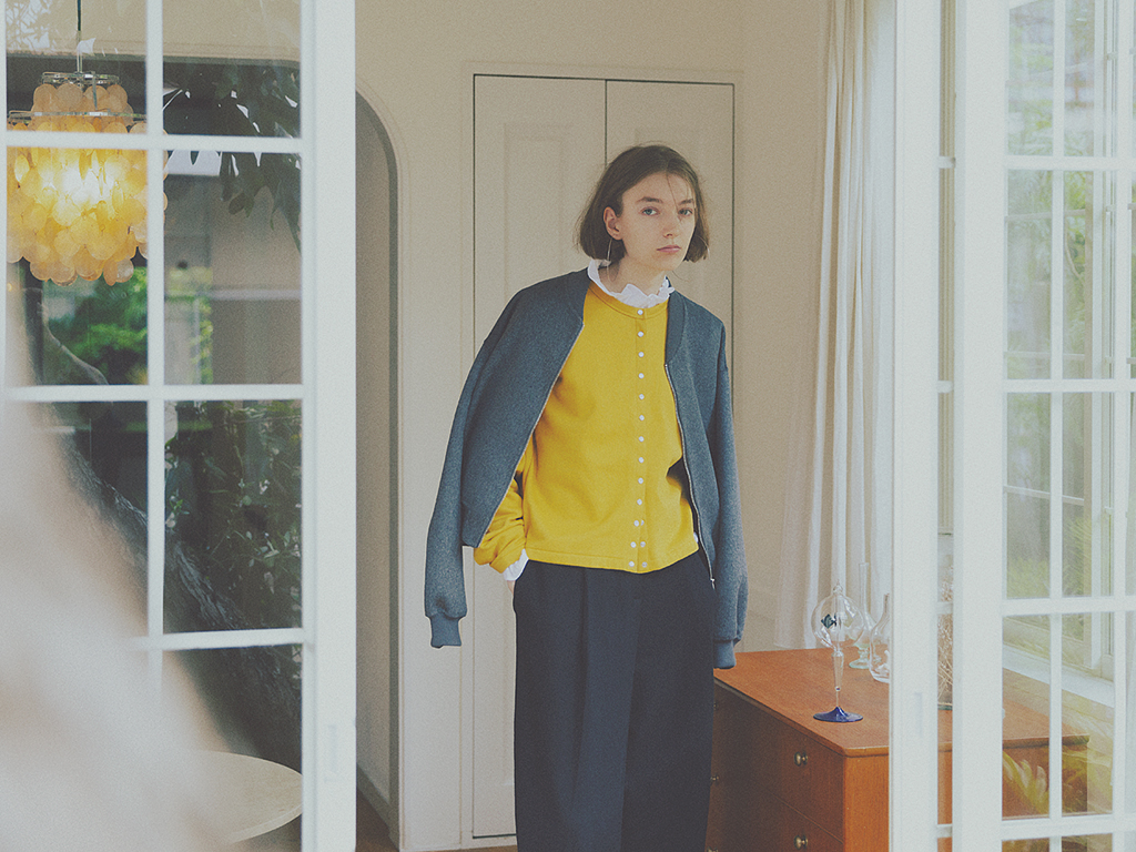 カジュアルとレディのいいとこどりした、スウェット素材のカーディガンを新たなバランサーとして抜擢。どちらともとれる1枚を軸にすれば、ほかはどんなテイストを重ねてもすんなりなじむ。フリルの甘さとブルゾンのやんちゃさを、間のスウェットで微調整。