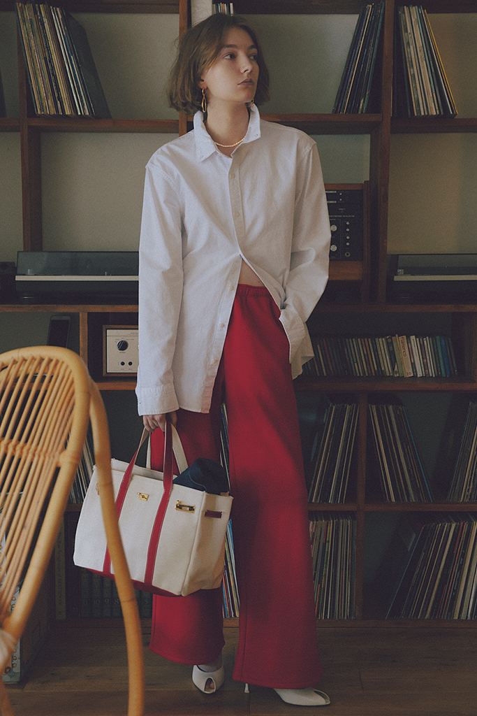 ハイウエストかつ直線的な形の、美脚なスウェットパンツに注目。シャープな表情を底上げする鮮烈な赤でとり込むと、パリッとしたシャツとつり合う、キレ味のいい見た目に。