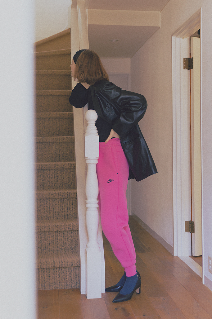 黒で引き締める常套手段は、スウェットにも効果的。小物と服で黒の割合を多くすると、より落ち着いた雰囲気へ寄せることが可能。着映えるスウェットを試すときこそ、ハズさない法則を忘れずに。高発色なピンクはボンディング風のソフトなパンツでハードルを下げて。色のインパクトを分散できる、ポインテッドトゥパンプスやレザージャケットなど強気な黒をセレクト。