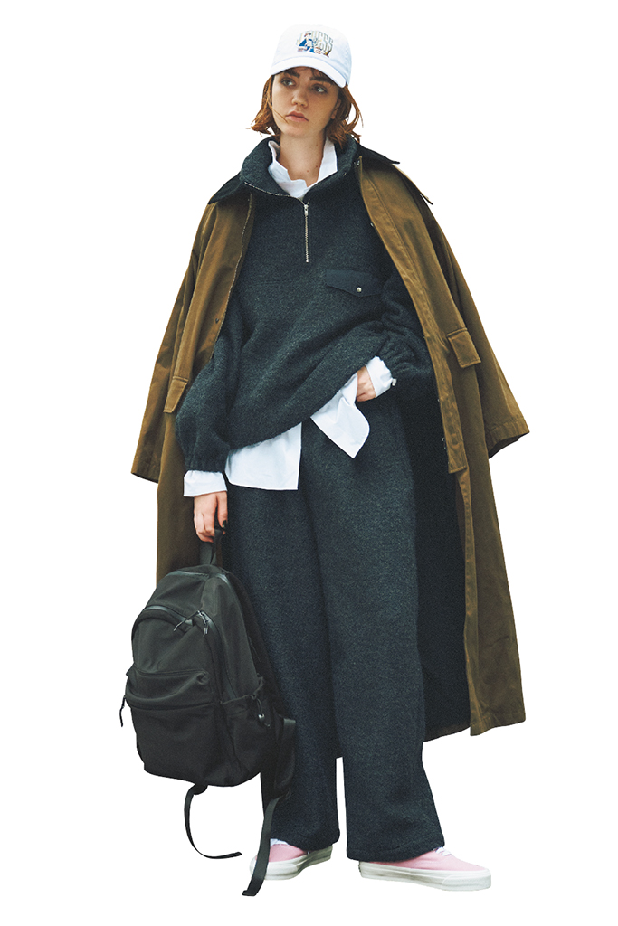 白シャツは着まわし。カーキロングコート 99,000円/SACRA(インターリブ) チャコールグレーハーフジップフリーストップス 36,300円、チャコールグレーベルトつきフリースパンツ 39,600円/ともにOblada(シンチ) 白ロゴキャップ 9,900円/J.PRESS BOY’S Collection(J.PRESS & SON’S AOYAMA) 黒リュック 17,380円/イムラム スニーカー 11,000円/Vans(Vans Japanカスタマーサポート)
