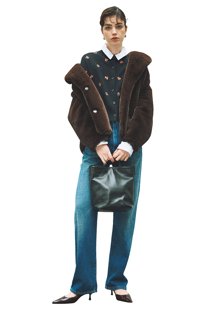 白シャツは着まわし。ブラウンファーコート 56,100円/JAKKE(ジャック・オブ・オール・トレーズ プレスルーム) 黒×花柄刺しゅうカーディガン 48,400円/ルル・ウィルビー(アルアバイル) ブルーデニムパンツ 26,400円/Levi’s® Vintage Clothing(リーバイ・ストラウス ジャパン) ゴールドピアス 7,040円/ピルグリム(ZUTTOHOLIC) バッグ 79,200円/メゾン カナウ(ヤマニ) パンプス 8,990円/MANGO